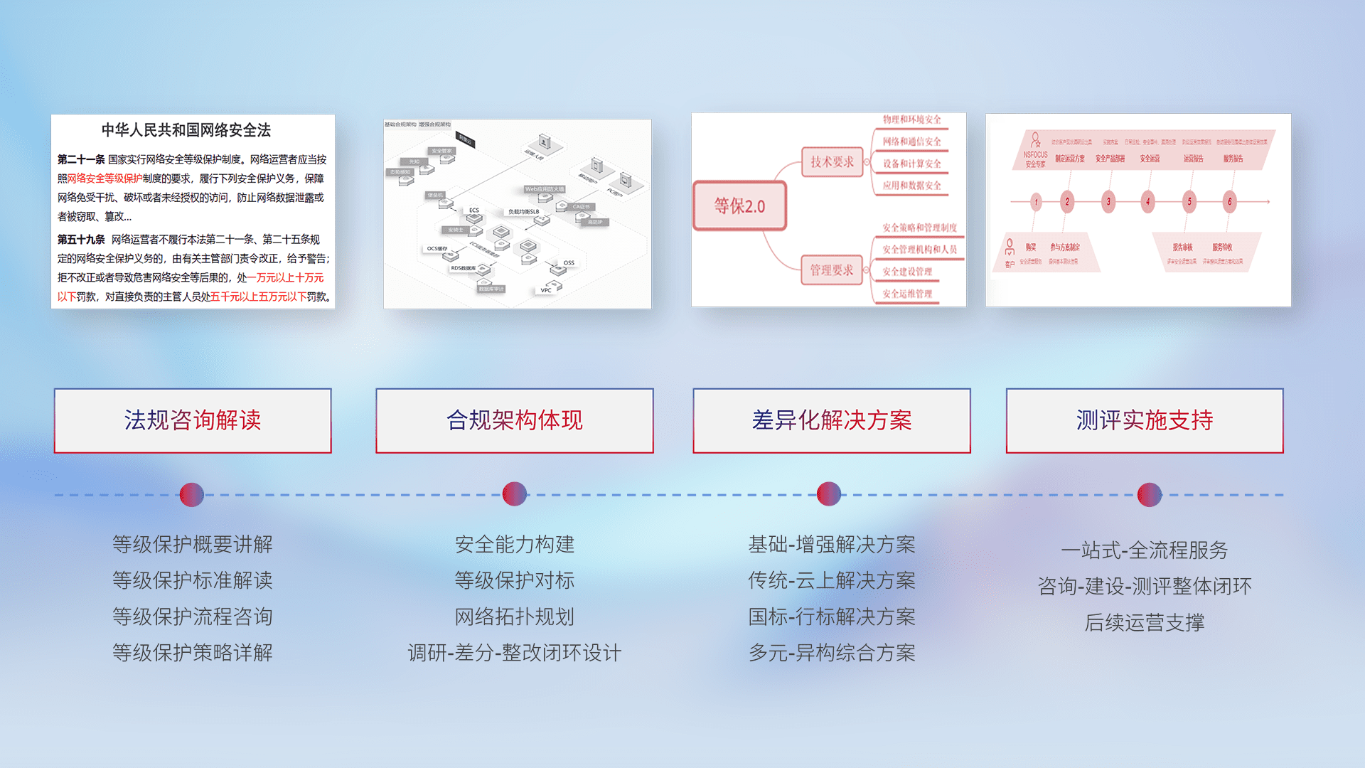 通过专业的法律咨询解读、、、、合规架构体现、、、、差异化解决方案、、测试实施支持等服务,,,为客户量身打造等保合规体系。。